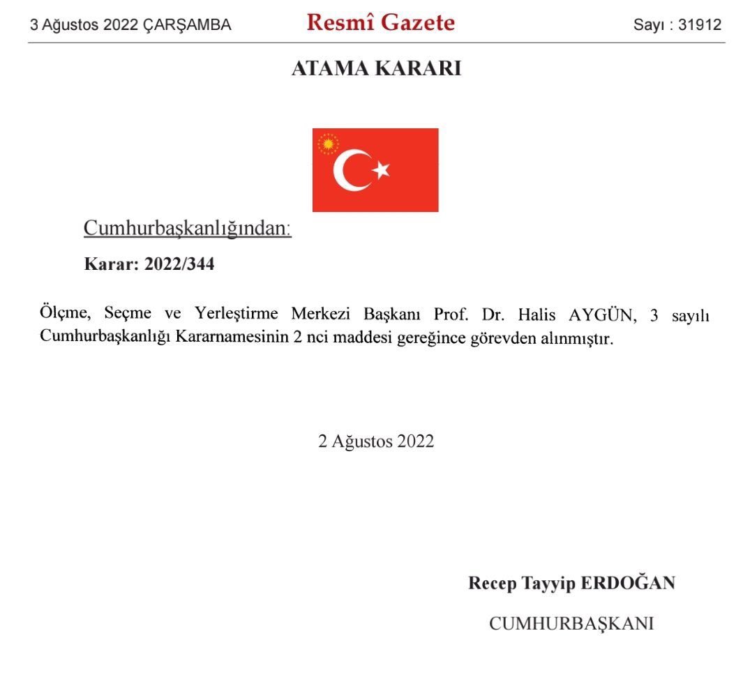 KPSS'de bazı soruların sızdırıldığı iddiasının ardından Ölçme, Seçme ve Yerleştirme Merkezi (ÖSYM) Başkanı Prof. Dr. Halis Aygün, Resmi Gazete'de yayımlanan Cumhurbaşkanlığı kararıyla görevden alındı.