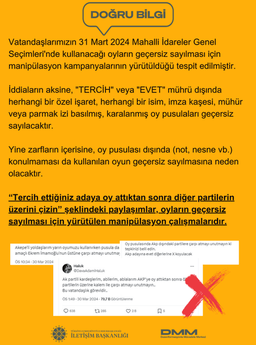 Vatandaşlarımızın 31 Mart 2024 Mahalli İdareler Genel Seçimleri'nde kullanacağı oyların geçersiz sayılması için manipülasyon kampanyalarının yürütüldüğü tespit edilmiştir.