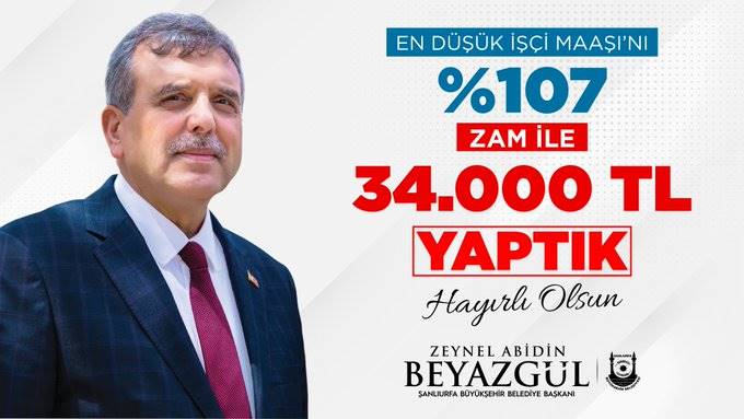 ŞANLIURFA- Şanlıurfa Büyükşehir Belediyesi bünyesinde görev alan personellere yüzde 107 oranında zam yapıldı. Şanlıurfa Büyükşehir Belediye Başkanı Zeynel Abidin Beyazgül, en düşük işçi maaşlarının 34 bin lira olduğunu açıkladı.