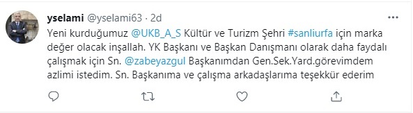 Urfa Kültür ve Bilişim A.Ş., geçtiğimiz aylarda kurulmuş, Genel Sekreter Yardımcısı Yıldız ise yönetim kurulu başkanlığı görevine getirilmişti.