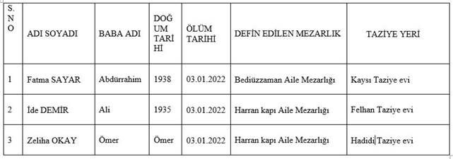 Şanlıurfa Büyükşehir Belediyesi Mezarlıklar Şube Müdürlüğü günlük defin listesini yayımladı. Yayımlanan yeni listeye göre Şanlıurfa genelinde 3 kişi hayatını kaybetti.