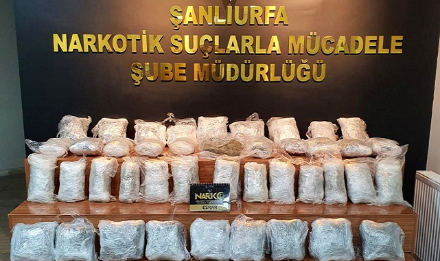 Şanlıurfa İl Emniyet Müdürlüğüne bağlı Narkotik Suçlarla Mücadele Şube Müdürlüğü ekipleri uyuşturucu madde ile mücadele kapsamında 2 ayrı araçta yaptıkları arama sonucu 60 parça halinde 30 kg skunk maddesi, 4 parça halinde 2,1 kg esrar maddesi ele geçirildi.