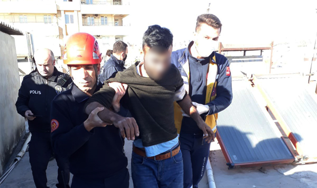 Uzun süren ikna çabaları sonucu intihardan vazgeçirilen genç, apartmanın çatısından indirildi.