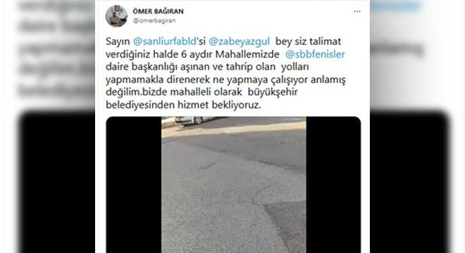 Ajans Balıklıgöl’e konuşan Bağıran, “Mahallemizin asfalt yollarında aşınma var ve kaldırımlar berbat. 2 yıl önce söz verilen bir park var” diyerek 6 ay önce Beyazgül ile telefonda konuşma fırsatı bulduğunu şu sözlerle anlattı: “6 ay önce sosyal medyada sitem dolu paylaşımlarım oldu. Bir şekilde kendisiyle telefonla görüşme fırsatım oldu. Mahallenin sorunlarını kendisine anlattım ve arkasından fen işleri tarafından arandım. Ertesi gün mahalleye gelip incelemede bulundular ve Mart ayında yapacağız dediler. Mart ayında da yapılmayınca tekrar aradım ve ‘ihaleye çıkıp öyle yapacağız’ dediler ama halen mahallede bir çalışma yok. Bunun ihale ile yapılmasına gerek yok bence. Yollarda aşınma var ve üzerine ince bir asfalt serilmesi sorunu çözer.”