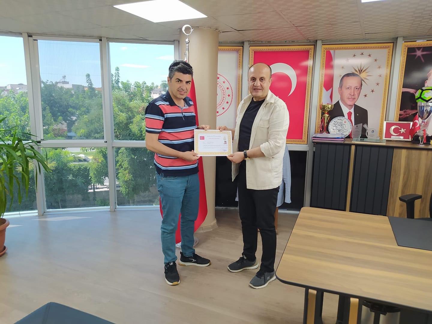Foto: İmamoğlu, Gençlik ve Spor İl Müdürü Halil Eren'in elinden başarı belgesini alırken.