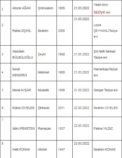 Şanlıurfa Büyükşehir Belediyesi Mezarlıklar Şube Müdürlüğü günlük defin listesini yayımladı. Yayımlanan listeye göre, Şanlıurfa genelinde 8 kişi hayatını kaybetti.