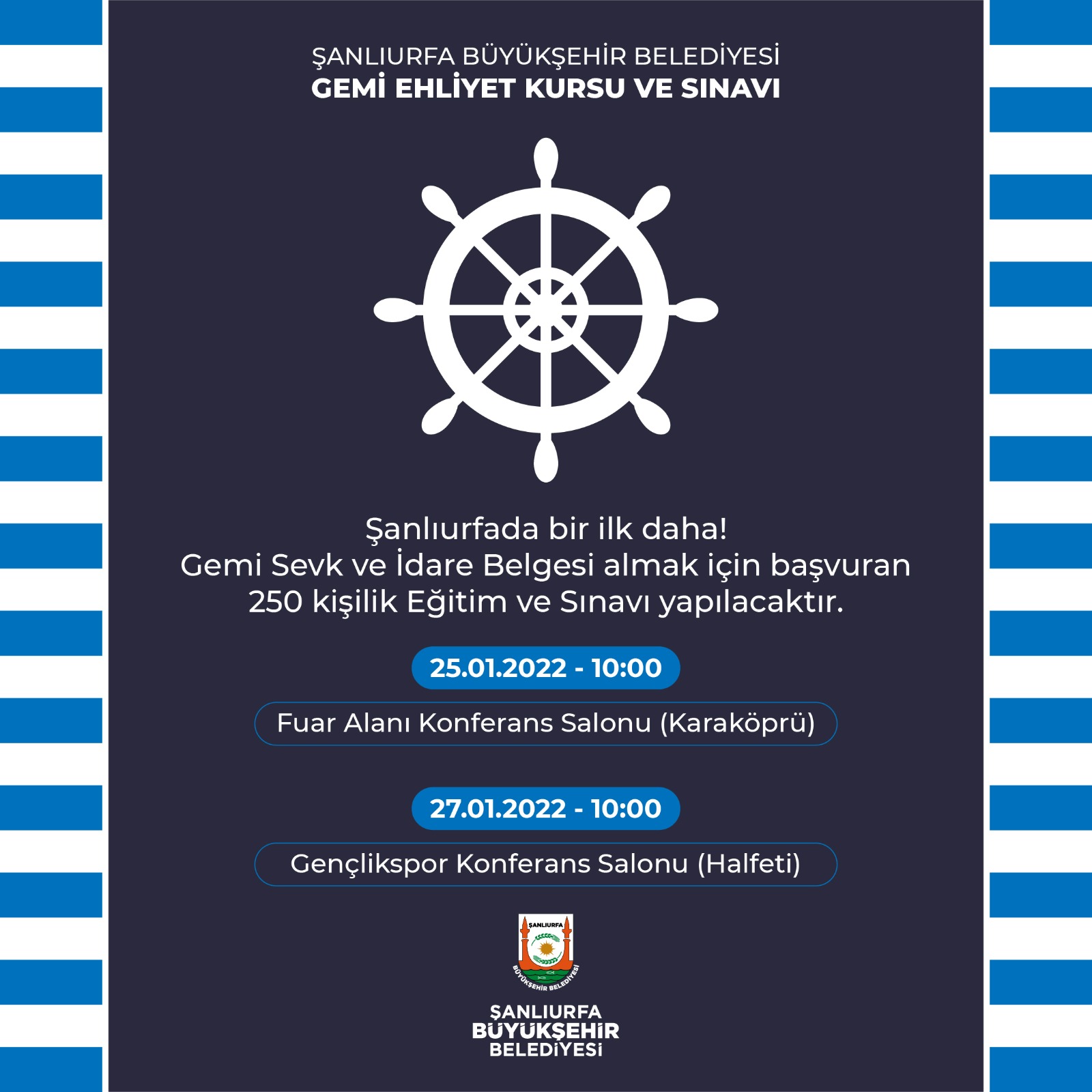 Gemi Sevk ve İdare Belgesi Eğitim sınavına 250 vatandaş müracaat etti. Gemi Sevk ve İdare Belgesi Eğitim sınavı 25 Ocak 2022 tarihinde saat 10:00’da Karaköprü ilçesindeki Şanlıurfa Fuar Alanı Konferans Salonu 27 Ocak 2022 Saat 10:00’da Halfeti’deki Gençlikspor Konferans Salonunda yapılacak.