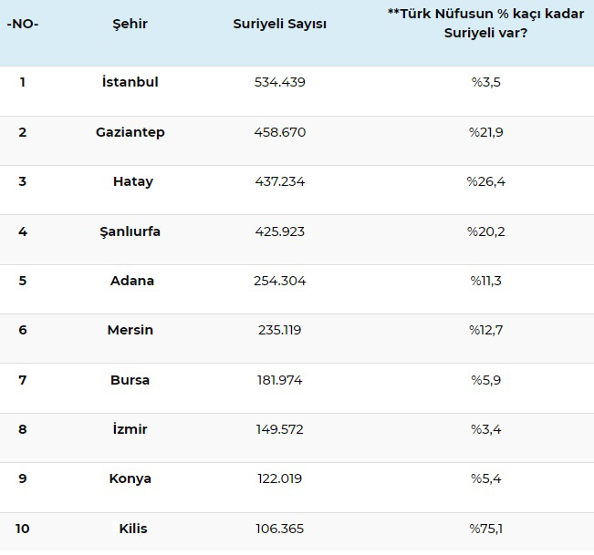 Türkiye'de Suriyelilerin en fazla yaşadığı 10 şehir şöyle: