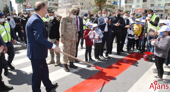 “Önce Yaya Uygulaması” ismiyle düzenlenen etkinlikte bir yaya geçidinin şeridini sembolik olarak kırmızıya boyayan Vali Erin, daha sonra araç sürücülerine broşür dağıtarak yaya geçiş önceliği konusunda dikkatli olmalarını istedi.