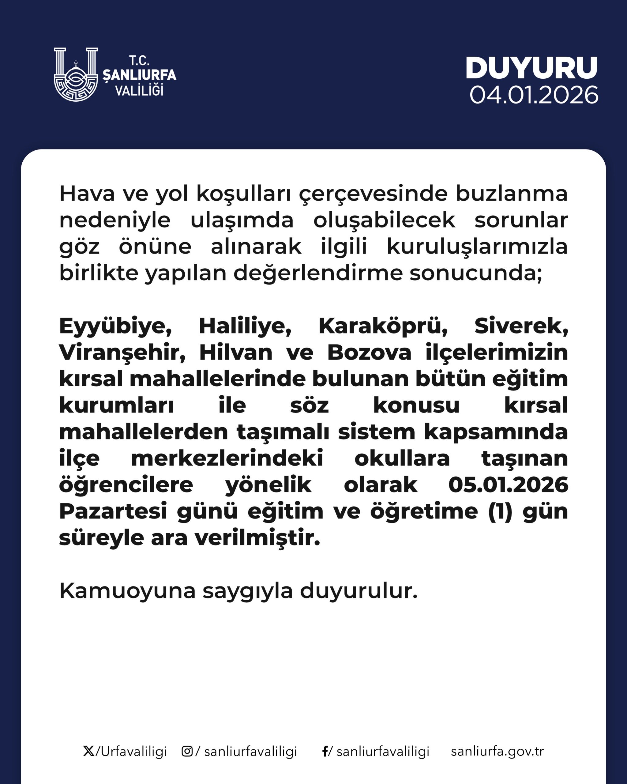 Şanlıurfa Valiliği, hava ve yol koşullarında yaşanan buzlanma nedeniyle ulaşımda oluşabilecek riskleri göz önünde bulundurarak bazı bölgelerde eğitime ara verildiğini duyurdu.Valilikten yapılan açıklamaya göre; Eyyübiye, Haliliye, Karaköprü, Siverek, Viranşehir, Hilvan ve Bozova ilçelerinin kırsal mahallelerinde bulunan tüm eğitim kurumlarında ile bu mahallelerden taşımalı sistem kapsamında ilçe merkezlerindeki okullara taşınan öğrenciler için, 5 Ocak 2026 Pazartesi günü eğitim ve öğretime 1 gün süreyle ara verildi.