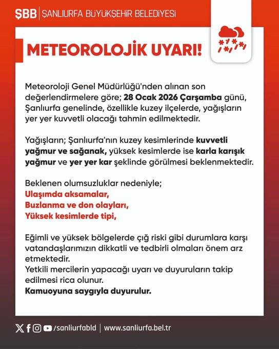 Yapılan açıklamaya göre, 28 Ocak 2026 Çarşamba günü Şanlıurfa genelinde, özellikle kuzey ilçelerde yağışların yer yer kuvvetli olacağı tahmin ediliyor. Yağışların kuzey kesimlerde kuvvetli yağmur ve sağanak, yüksek kesimlerde ise karla karışık yağmur ve yer yer kar şeklinde görülmesi bekleniyor.