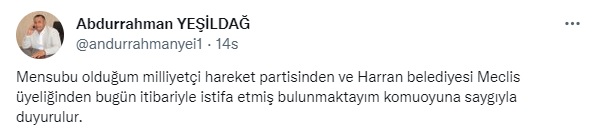 İstifa gerekçesini belirtmeyen Yeşildağ’a Ajans Balıklıgöl ulaştı. Yeşildağ, istifa gerekçesini “Ailevi nedenlerden dolayı” şeklinde açıkladı ve siyaseti tamamen bıraktığını söyledi.