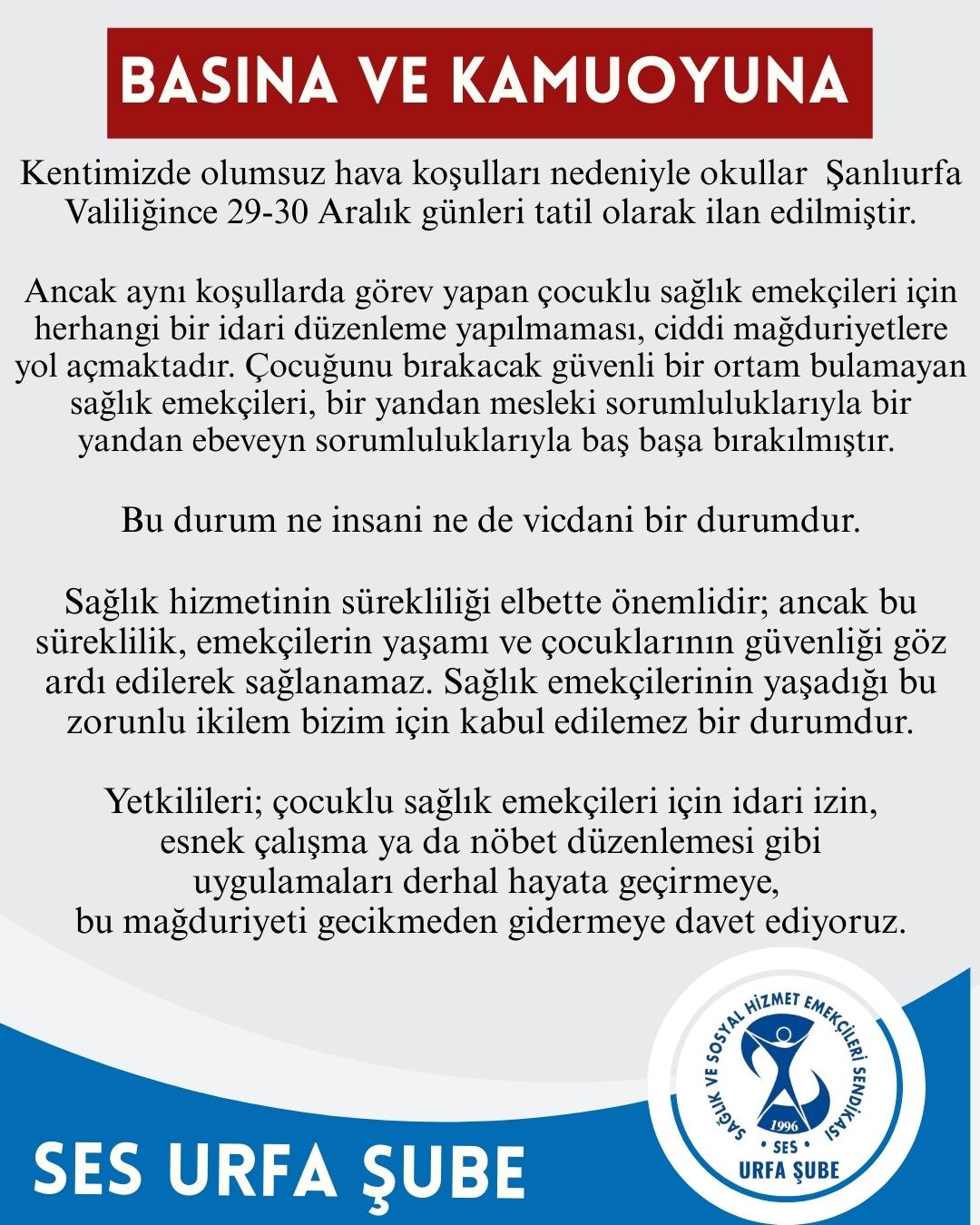 SES Şanlıurfa Şubesi yaptığı açıklamada, sağlık emekçilerinin hem mesleki sorumluluklarıyla hem de ebeveyn sorumluluklarıyla baş başa bırakıldığını belirtti. Açıklamada, “Çocuğunu bırakacak güvenli bir ortam bulamayan sağlık emekçileri ciddi mağduriyet yaşamaktadır. Bu durum ne insani ne de vicdani bir durumdur” denildi.