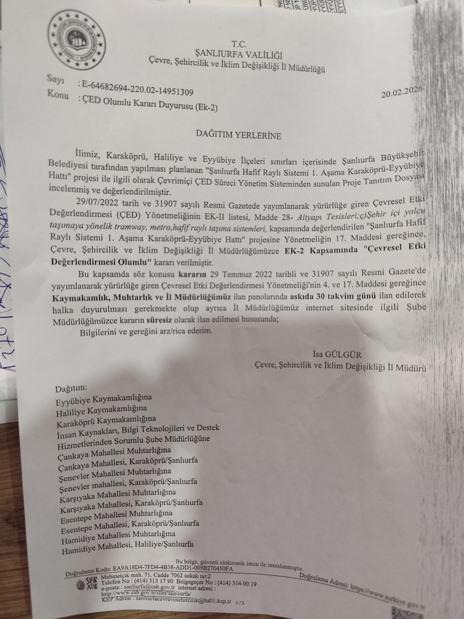 ŞANLIURFA- Şanlıurfa Valiliği Çevre, Şehircilik ve İklim Değişikliği İl Müdürlüğü tarafından yapılan duyuruya göre, Şanlıurfa Büyükşehir Belediyesi’nin Karaköprü, Haliliye ve Eyyübiye ilçelerini kapsayan “Şanlıurfa Hafif Raylı Sistemi 1. Aşama Karaköprü–Eyyübiye Hattı” projesi, ÇED sürecinin tamamlanmasının ardından uygun bulundu.