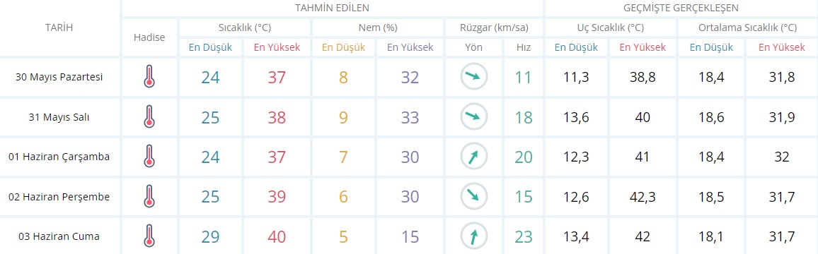 Meteorolojinin son tahminlerine göre 30 Mayıs Pazartesi günü kentte sıcaklığın 37 dereceye kadar ulaşması bekleniyor. Haftanın ilk günü rüzgarın saatte 11 kilometre hıza ulaşacağı açıklandı. Salı günü sıcaklık ile birlikte rüzgarın hızı da artacak. Perşembe ve Cuma günü Şanlıurfa’da sıcaklığın 39 ile 40 dereceye ulaşması bekleniyor.