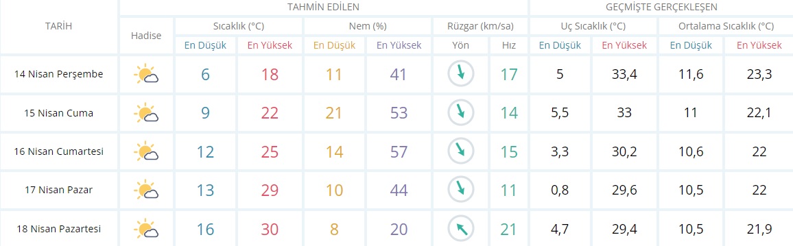 Tahminlere göre gökyüzü az bulutlu olacak. Rüzgarın hızı önümüzdeki günlerde saatte 14 ile 21 kilometre arasında değişiklik gösterecek. 5 günlük hava tahmini raporuna göre nem oranı önümüzdeki 5 gün yüzde 57 ile yüzde 20 arasında değişiyor.