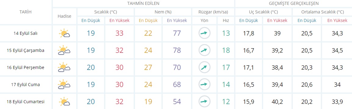 Önümüzdeki günlerde gün içinde beklenen en yüksek sıcaklıklar 30 dereceye kadar düşecek. Sıcaklıkların Çarşamba günü 32, Perşembe ve Cuma günü ise 30 dereceyi bulması bekleniyor.