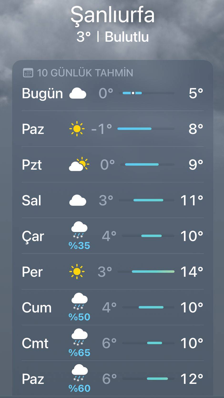 ŞANLIURFA- Hafta sonu güneş yüzünü gösterse de gece sıcaklıkları sıfırın altına düşecek. Pazar günü en düşük sıcaklığın -1 dereceye kadar inmesi beklenirken, gündüz sıcaklığı 8 derece olacak. Pazartesi ve salı günleri ise parçalı ve çok bulutlu hava hâkim olacak, sıcaklıklar kademeli olarak artarak 11 dereceye kadar çıkacak.Çarşamba gününden itibaren yağışlı hava yeniden etkili olacak. Çarşamba günü yüzde 35, cuma günü yüzde 50, cumartesi günü yüzde 65 ve pazar günü yüzde 60 oranında karla karışık yağmur ve kar yağışı bekleniyor. Özellikle gece ve sabah saatlerinde buzlanma riskine karşı sürücülerin dikkatli olması istendi.Yetkililer, ani sıcaklık değişimleri ve beklenen yağışlar nedeniyle vatandaşları tedbirli olmaya çağırırken, önümüzdeki hafta perşembe günü sıcaklıkların 14 dereceye kadar yükselmesiyle kısa süreli bir ısınma yaşanacağı bildirildi.