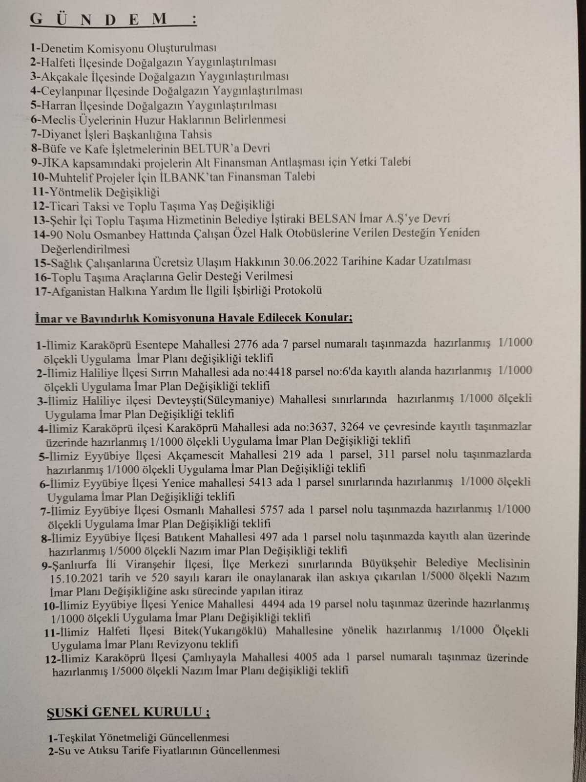 Şanlıurfa Büyükşehir Belediyesinin 2022 yılı Ocak ayı olağan toplantısının gündem maddeleri şöyle: