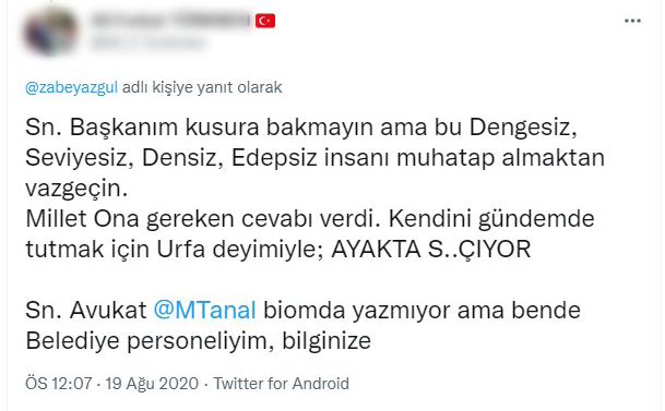 CHP’li Tanal’ın “Oğlun ne iş yapıyor” sorusuna “Kızın ne iş yapıyor” şeklinde yanıt veren Şanlıurfa Büyükşehir Belediye Başkanı Zeynel Abidin Beyazgül’ün sosyal medyadaki bu paylaşımının altına, Tanal’a hakaret içeren yorumlar yapan belediye personeli hakkında açılan dava sonuçlandı. CHP İstanbul Milletvekili Av. Mahmut Tanal’ın şikayeti üzerine Ankara 43. Asliye Ceza Mahkemesi’nde görülen davada, Şanlıurfa Büyükşehir Belediyesinde şube müdürlüğü görevini yürüten Ali Ferhat T. adli para cezasına çarptırıldı. Tanal, bu kararın ardından Ali Ferhat T. hakkında tazminat davası da açtı.
