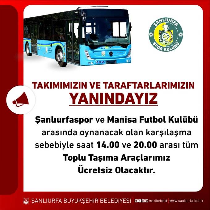 “Şanlıurfaspor ve Manisa Futbol Kulübü arasında oynanacak olan karşılaşma sebebiyle saat 14.00 ve 20.00 arası tüm toplu taşıma araçlarımız ücretsiz olacaktır”.