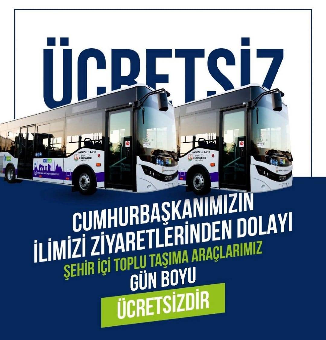 Şanlıurfa Büyükşehir Belediyesi, CumhurbaşkanıRecep Tayyip Erdoğan’ın Şanlıurfa’ya yapacağı ziyaretinden dolayı şehir içi otobüslerinin gün boyu ücretsiz hizmet vereceğini duyurdu.