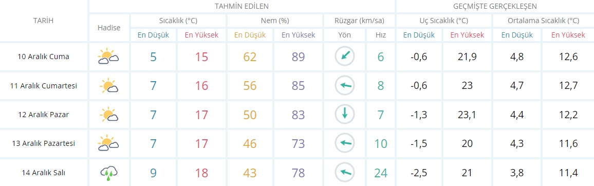 Meteoroloji Genel Müdürlüğü'nün bugün açıkladığı verilere göre; sıcaklık, 10 Aralık Cuma günü 15 dereceye kadar düşecek ve cuma günü, önümüzdeki 5 günün en soğuk günlerinden birisi olacak. Kentte hava sıcaklığı cumartesi 16 derece, pazar ve pazartesi günlerinde 17 derece olacak. 14 Aralık salı günü ise yağış beklendiği bildirildi.