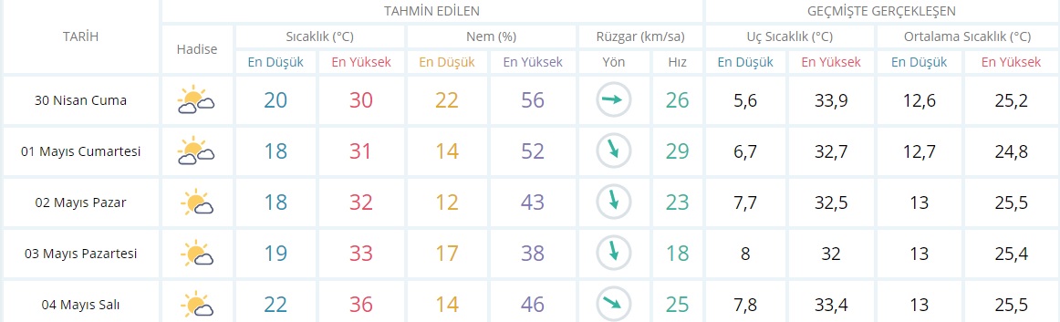 Pazar gününden itibaren artış başlıyor. Havanın az bulutlu olması beklenen Pazar günü için tahmin edilen en yüksek sıcaklık 32 derece.