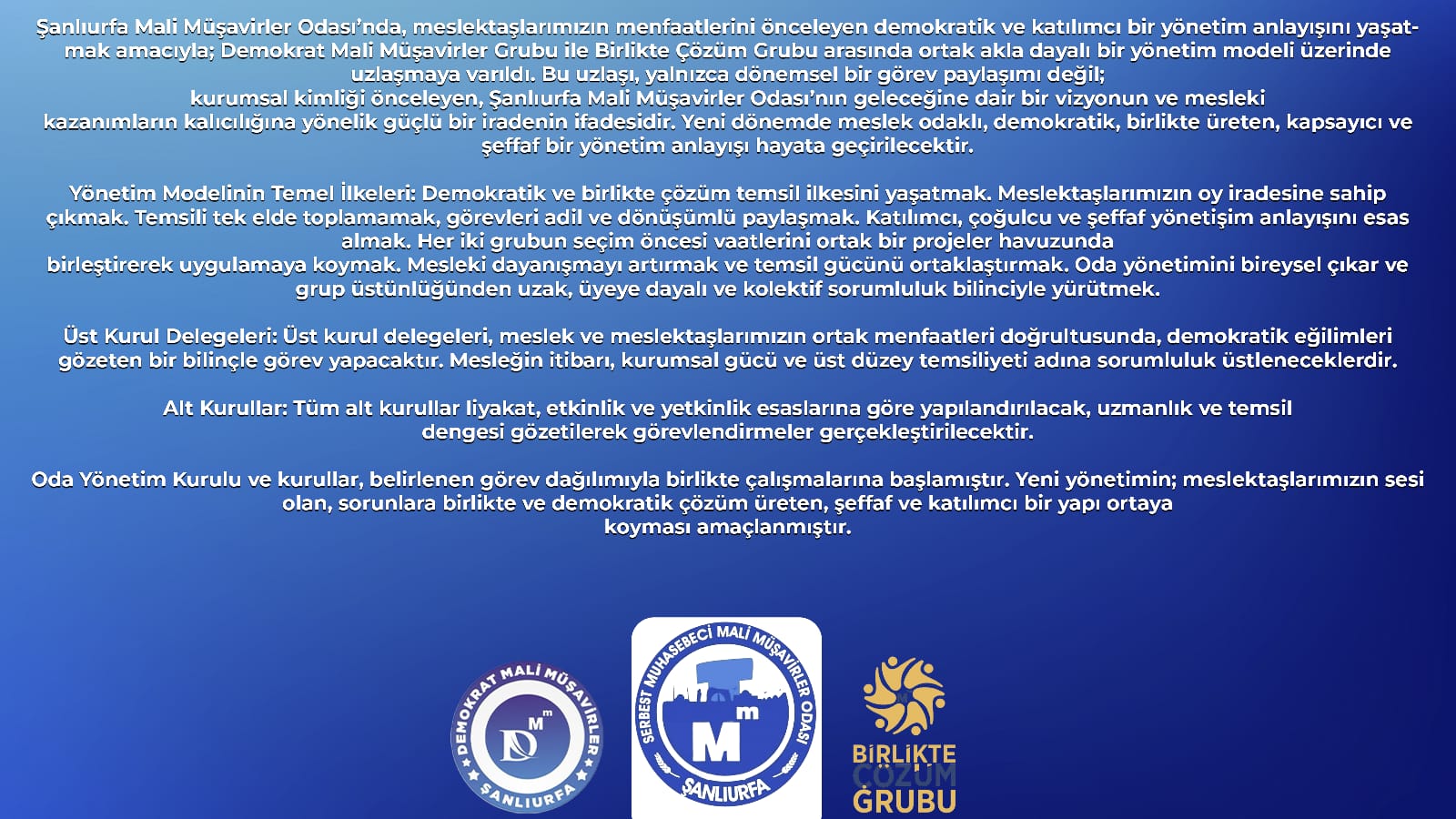 ŞANLIURFA- Şanlıurfa Mali Müşavirler Odası’nda 25. Olağan Seçimlerin ardından oluşan yeni yönetim kurulu, 17 Haziran 2025 tarihinde gerçekleştirilen toplantı ile görev dağılımını yaptı.