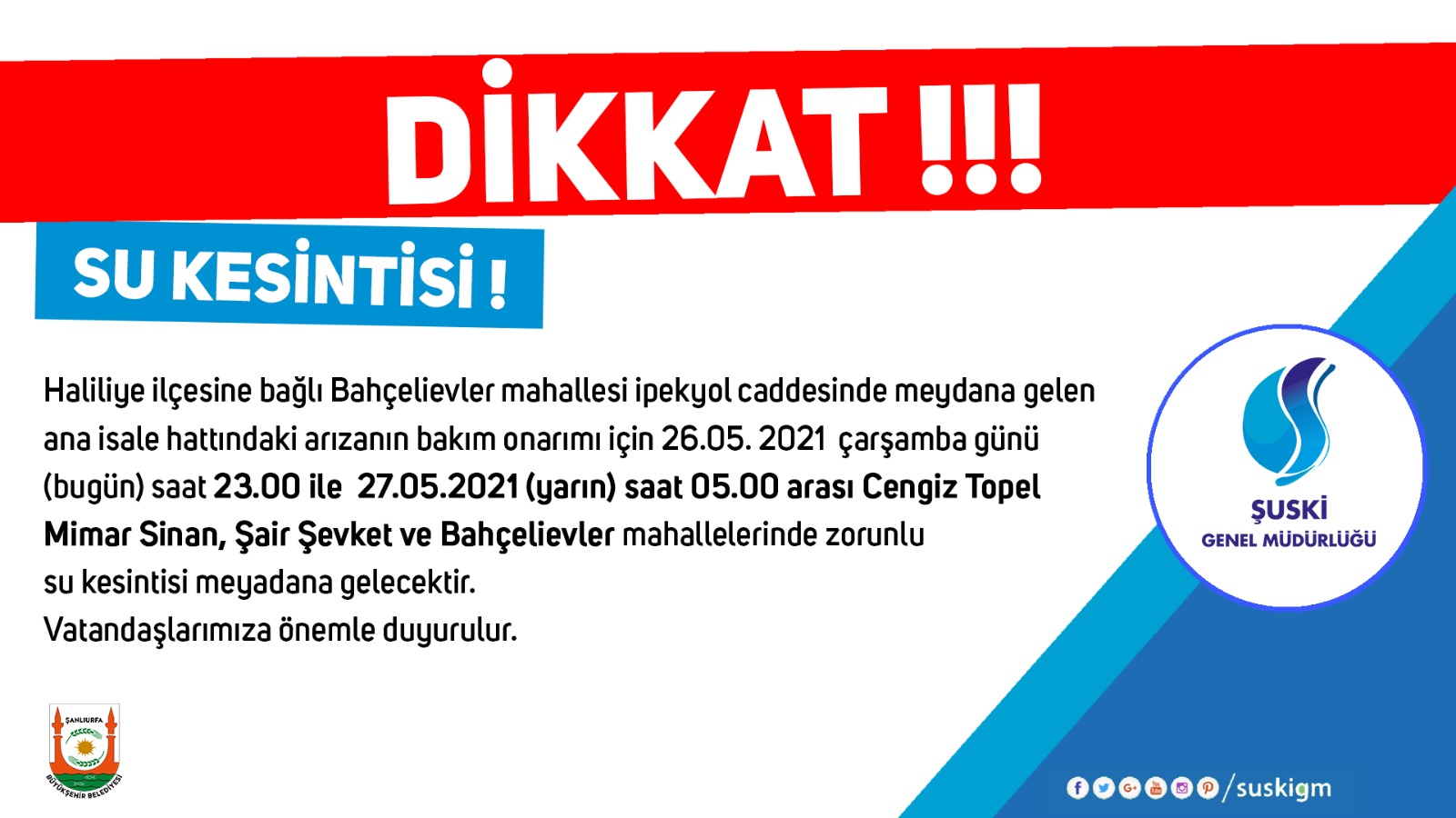 Merkez Haliliye ilçesine bağlı Cengiz Topel, Mimar Sinan, Şair Şevket ve Bahçelievler mahallelerinde suların kesileceği açıklandı.