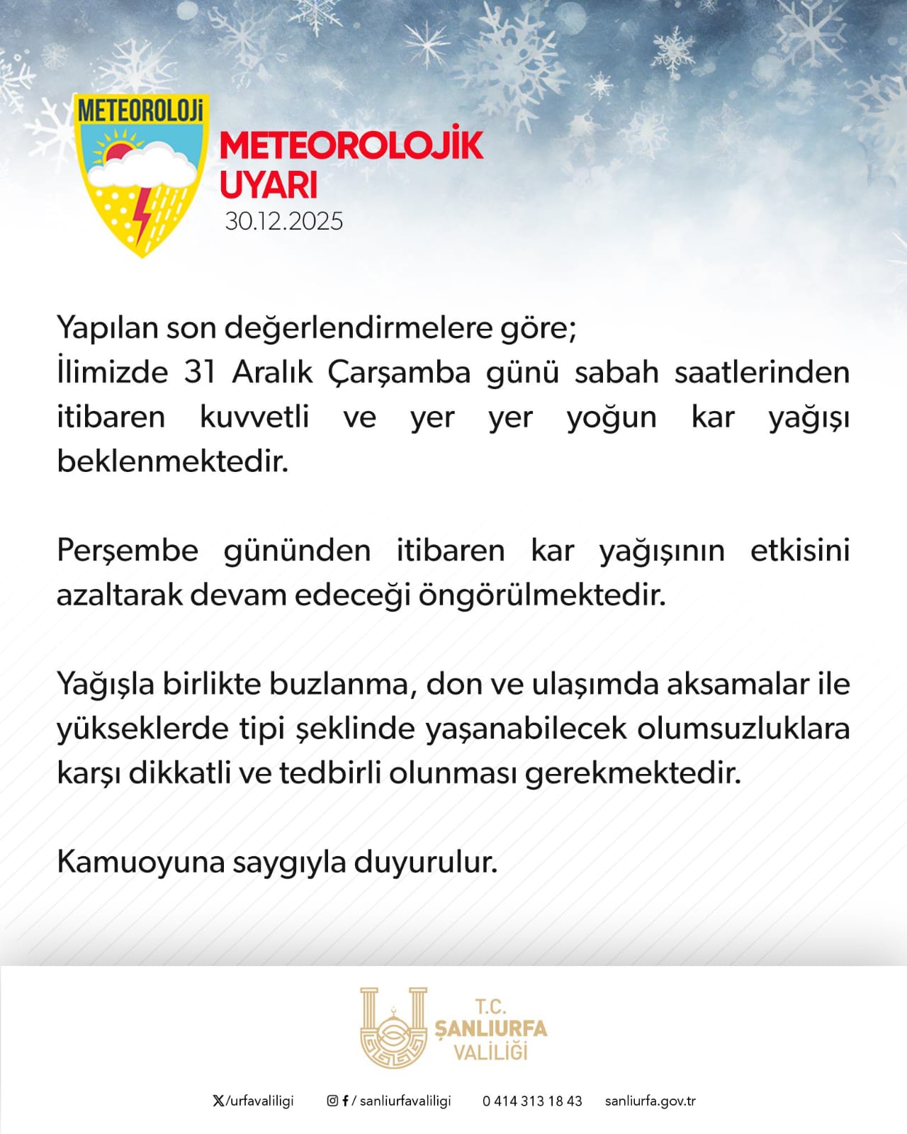 Valilik tarafından yapılan duyuruda, 31 Aralık Çarşamba günü sabah saatlerinden itibaren Şanlıurfa genelinde kuvvetli ve yer yer yoğun kar yağışının etkili olmasının beklendiği bildirildi. Kar yağışının Perşembe gününden itibaren etkisini azaltarak devam edeceği öngörülüyor.