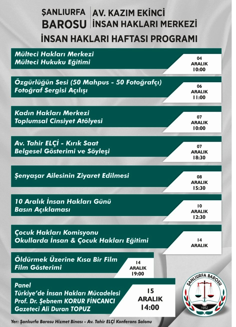 Merkez, İnsan Hakları Haftasında adliye önündeki nöbetlerini sürdüren Şenyaşar ailesini ziyaret edecek. 15 Aralık’ta “Türkiye’de insan hakları mücadelesi” paneli düzenlenecek. Panele Prof. Dr. Şebnem Korur Fincancı ile gazeteci Ali Duran Topuz konuşmacı olarak katılacak isimler.