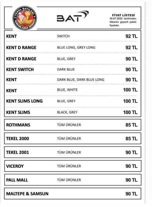 - Tekel 2001, Viceroy, Pall Mall, Maltepe & Samsun markalarının ise 90 TL olduğu bildirildi.