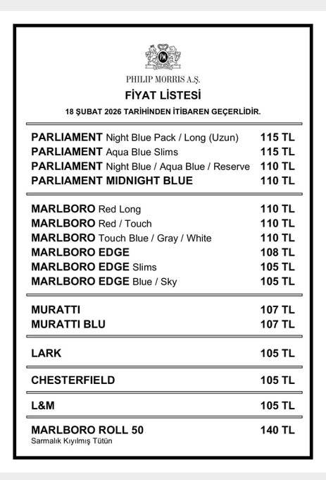 Philip Morris A.Ş., 18 Şubat 2026 tarihinden itibaren geçerli olacak sigara fiyatlarını duyurdu. Listede, özellikle Parliament ve Marlboro markalarında fiyat güncellemeleri dikkat çekiyor.