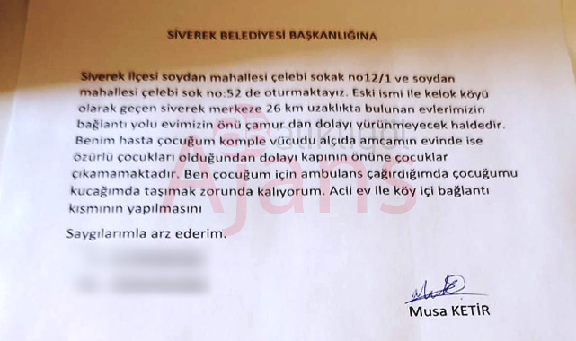 “Siverek ilçesi Soydan mahallesi Çelebi sokak no:12/1 ve Soydan mahallesi Çelebi sok no:52’de oturmaktayız. Eski ismi ile Kelok köyü olarak geçen Siverek merkeze 26 km uzaklıkta bulunan evlerimizin bağlantı yolu evimizin önü çamurdan dolayı yürünmeyecek haldedir. Benim hasta çocuğum komple vücudu alçıda, amcamın evinde ise özürlü çocukları olduğundan dolayı kapının önüne çocuklar çıkamamaktadır. Ben çocuğum için ambulans çağırdığımda çocuğumu kucağımda taşımak zorunda kalıyorum. Acil ev ile köy içi bağlantı kısmının yapılmasını saygılarımla arz ederim.”