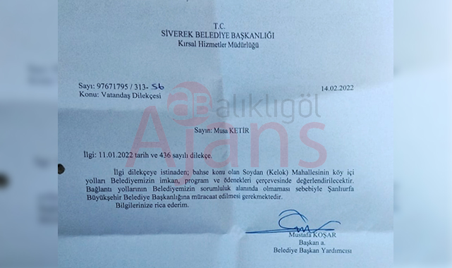 Siverek Belediyesi tarafından dilekçeye verilen yanıtta “İlgili dilekçeye istinaden; bahse konu olan Soydan (Kelok) Mahallesinin köy için yolları belediyemizin imkan, program ve ödenekleri çerçevesinde değerlendirilecektir. Bağlantı yollarının belediyemizin sorumluluk alanında olmaması sebebiyle Şanlıurfa Büyükşehir Belediye Başkanlığına müracaat edilmesi gerekmektedir” denildi.