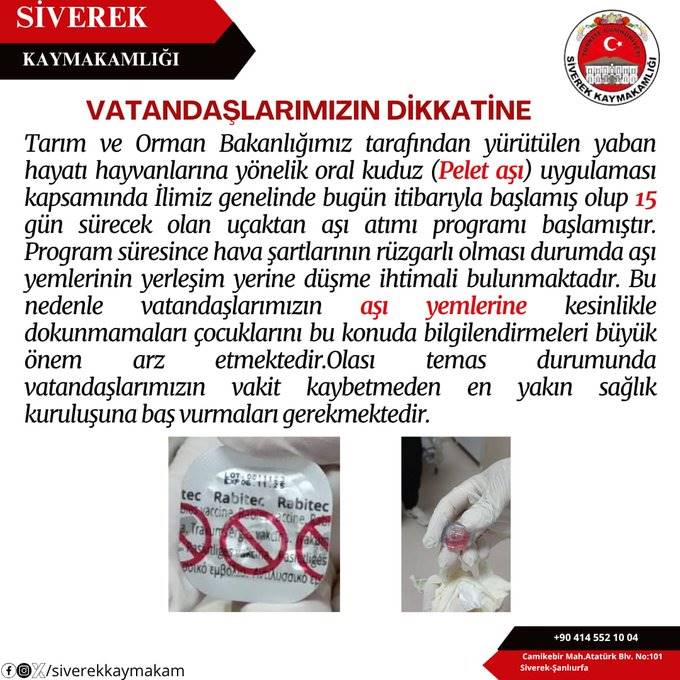 Yetkililer, özellikle rüzgarlı hava koşullarında aşı yemlerinin yerleşim alanlarına düşme ihtimaline dikkat çekerek vatandaşları uyardı. Açıklamada, "Aşı yemlerine kesinlikle dokunulmamalı, çocuklar bu konuda bilgilendirilmeli" ifadelerine yer verildi.