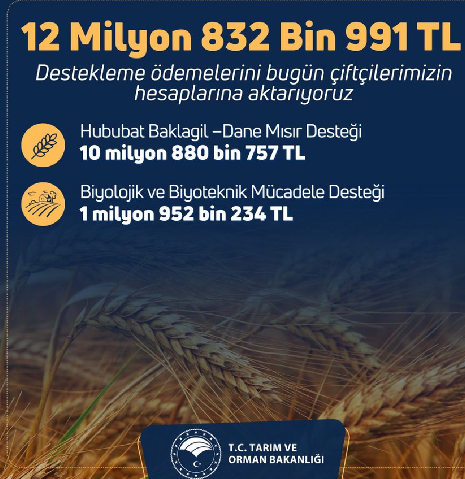 "12 milyon 832 bin 991 TL tarımsal destekleme ödemelerini bugün çiftçilerimizin hesaplarına aktarıyoruz.