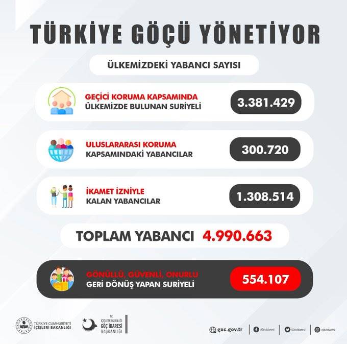 Göç İdaresi Başkanlığı’nın sosyal medya hesabı üzerinden yapılan paylaşımında, Ülke genelinde yabancı sayısının toplam 4 milyon 990 bin 663 olduğu kaydedildi.
