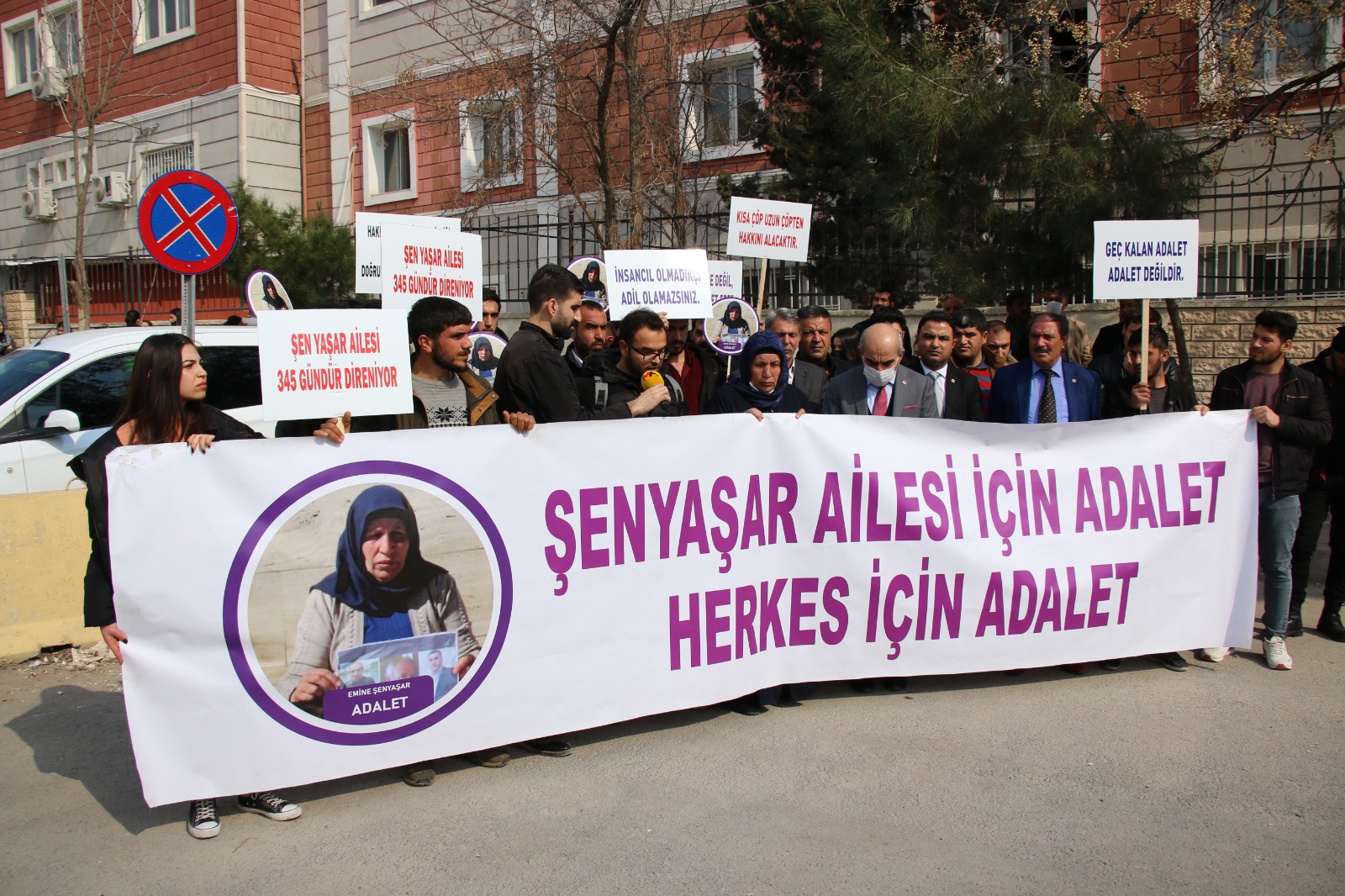 Emine Şenyaşar ile oğlu Ferit Şenyaşar’ın Şanlıurfa Adliyesi önünde 9 Mart 2021’de ‘adalet’ talebiyle başlattığı nöbet 345’inci gününde de devam etti. Adliye önünde nöbet tutan aileyi Harran Üniversitesi öğrencileri ziyaret etti. Ellerinde “Hak hukuk adalet” ve “Kısa çöp uzun çöpten hakkını alacaktır” yazılı dövizler taşıyan öğrenciler, “Şenyaşar ailesi için adalet herkes için adalet” pankartı açtı.