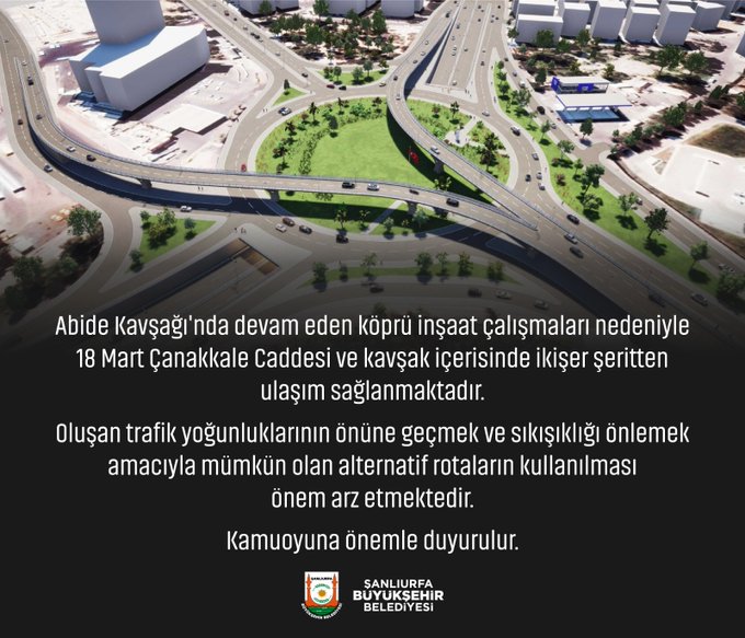 Çalışmalar devam ederken Şanlıurfa Büyükşehir Belediyesinden bir uyarı geldi. Büyükşehirden sürücüleri ilgilendiren uyarıda şu ifadelere yer verildi:Abide Kavşağı’nda devam eden köprü inşaat çalışmaları nedeniyle 18 Mart Çanakkale Caddesi ve kavşak içerisinde ikişer şeritten ulaşım sağlanmaktadır. Oluşan trafik yoğunluklarının önüne geçmek ve sıkışıklığı önlemek amacıyla mümkün olan alternatif rotaların kullanılması önem arz etmektedir. Kamuoyuna önemle duyurulur’’
