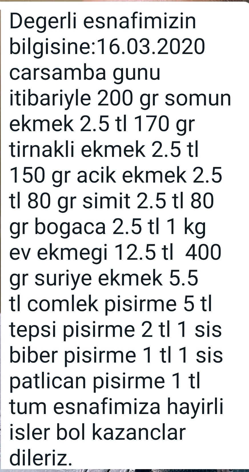 Şanlıurfa Fırıncılar odasından yapılan açıklamada, "16.03.2022 Çarşamba gününden itibaren; 200 gram somun 2,5 TL, 170 gram tırnaklı ekmek 2,5 TL, 150 gram açık ekmek 2,5 TL, 80 gram sitim 2,5 TL, 1 Kilo ev ekmeğe 12,5 TL 400 gram Suriye ekmeği 5,5 TL, Tepsi pişirme 2 TL, Biber pişirme 1 TL oldu" denildi.