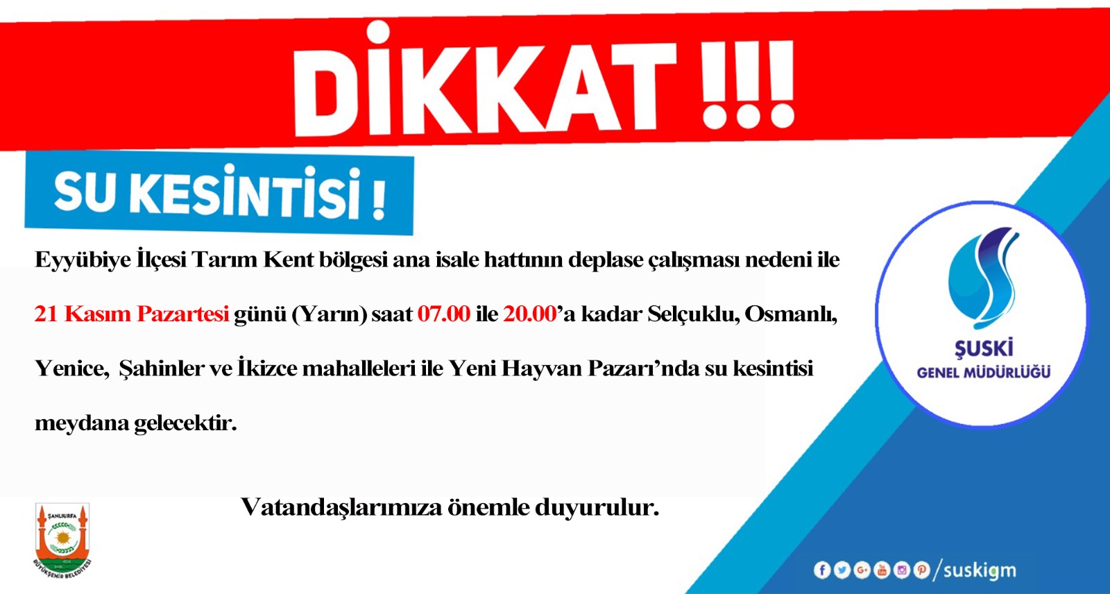 Şanlıurfa'nın Merkez Eyyübiye ilçesi Tarım Kent bölgesi anaisale hattının deplase çalışması nedeniyle 21 Kasım pazartesi günü 07:00 ile 23.00 saatleri arasında su kesintisi yaşanacak.
