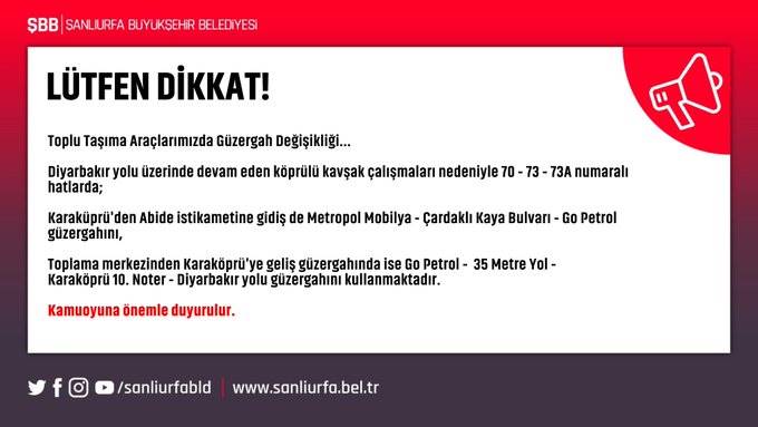 Diyarbakır yolu üzerinde devam eden köprülü kavşak çalışmaları nedeniyle 70-73-73A numaralı hatlarda, Karaküprü'den Abide istikametine gidiş de Metropol Mobilya - Çardaklı Kaya Bulvarı – Go Petrol güzergahını Toplama merkezinden Karaköprü'ye geliş güzergahında ise Go Petrol - 35 Metre Yol - Karaköprü 10. Noter - Diyarbakır yolu güzergahını kullanmaktadır.”