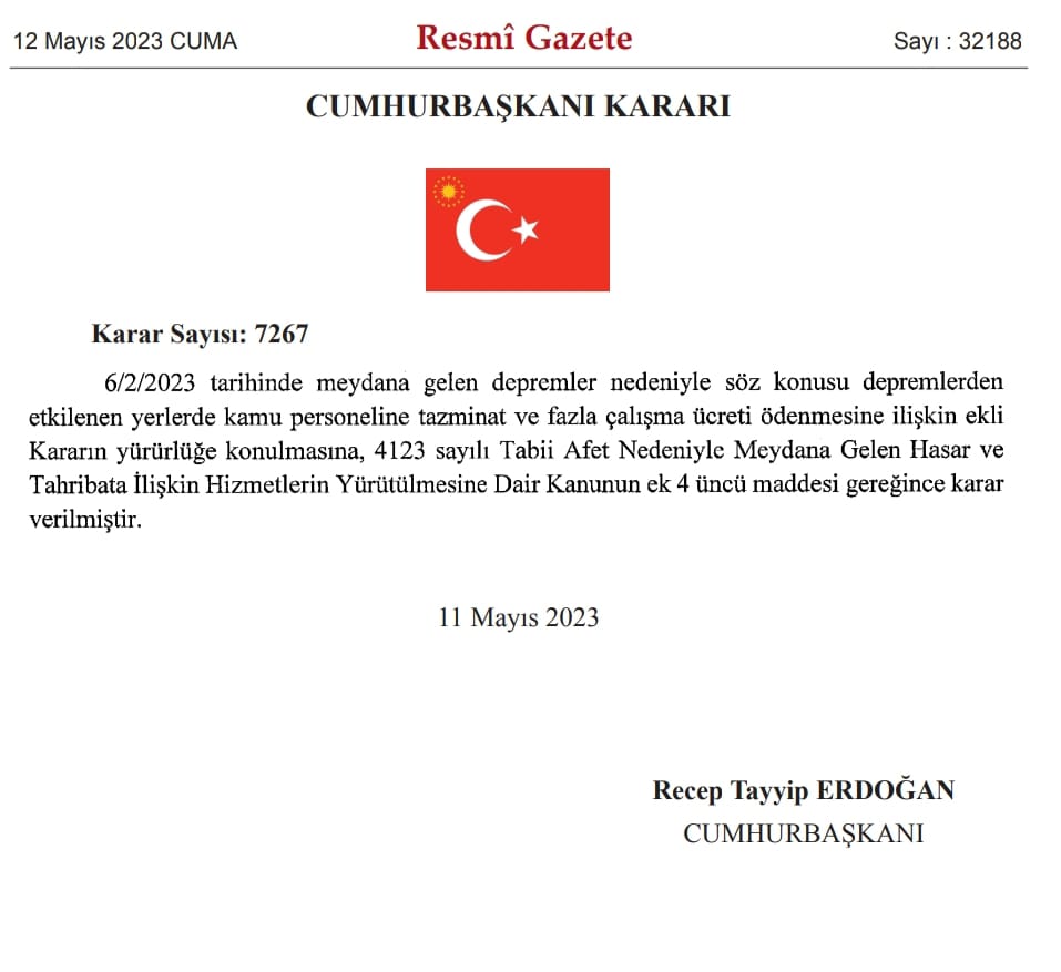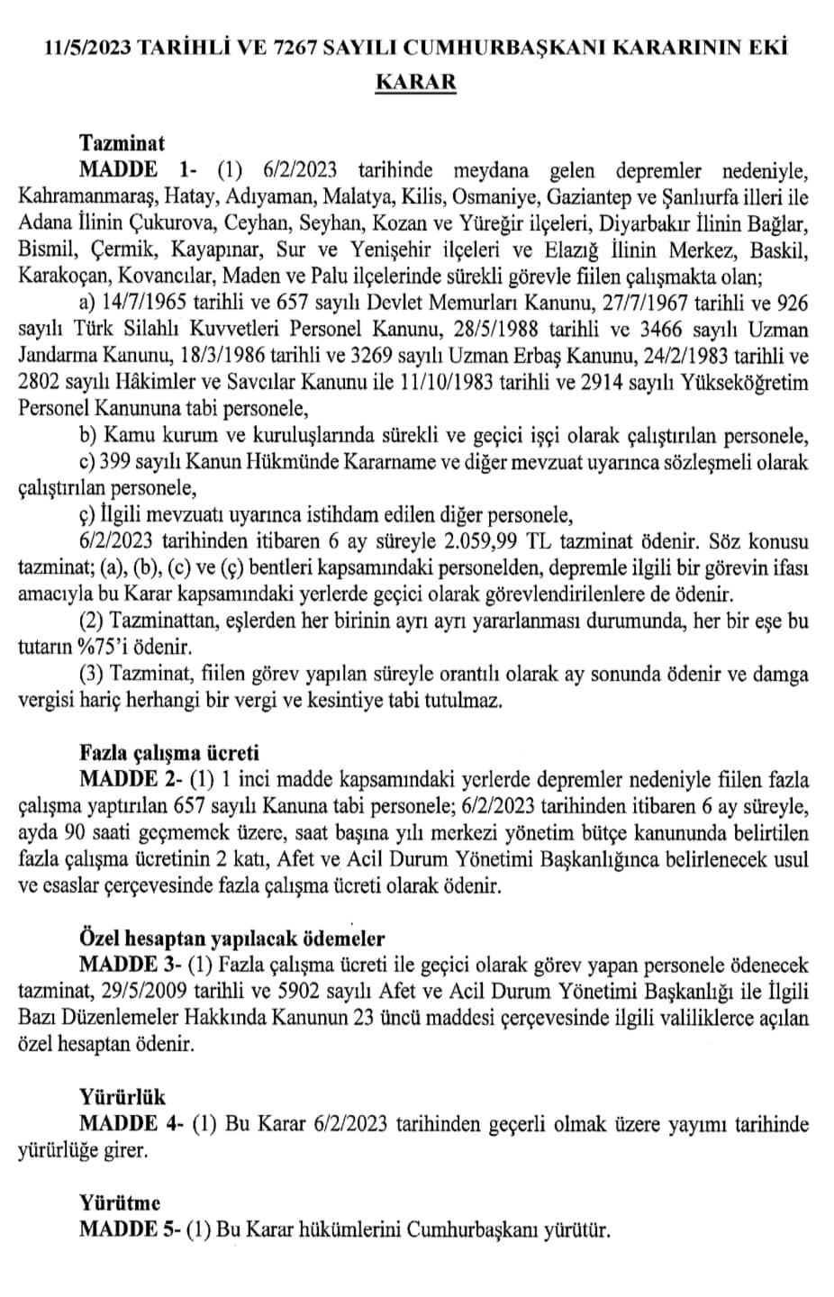Cumhurbaşkanı Erdoğan’ın imzasıyla Resmi Gazete’de yayımlanan karara göre, Kahramanmaraş merkezli depremlerinden etkilenen Şanlıurfa dahil 11 ilde görev yapan kamu personeline 2 Şubat'tan itibaren 6 ay süreyle 2 bin 59 lira tazminat ve fazla çalışma ücreti ödenecek.