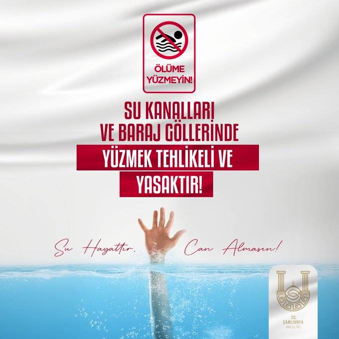 Şanlıurfa’da hava sıcaklıklarının artmasıyla son dönemde artan boğulma vakalarına karşı Valilikten uyarı yapıldı. Yapılan uyarıda, “Kendinizin ve sevdiklerinizin can güvenliği için, çeşitli riskler taşıyan su kanalları ve baraj göllerinde yüzmekten lütfen kaçınınız.” İfadelerine yer verildi.