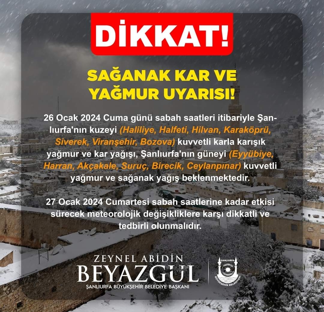 Şanlıurfa Büyükşehir Belediyeside meteorolojiden yapılan açıklamaya göre, kent genelinde kuvvetli olması beklenen kar ve sağanak yağışa karşı vatandaşları dikkatli ve tedbirli olunması konusunda uyardı.