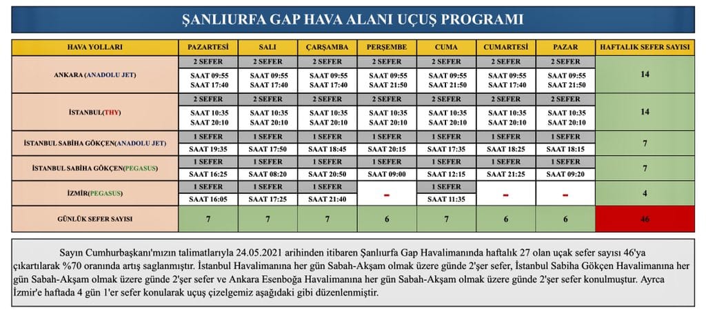 Başkan Kırıkçı, "Pazartesi(24/05/2021) gününden itibaren Şanlıurfa, artık Gaziantep veya Diyarbakır’dan uçmayacak. Şanlıurfa GAP Havaalanı için yeni sefer programı başlıyor. Sayın Cumhurbaşkanıma göstermiş olduğu ilgi ve hassasiyetten dolayı saygılarımı sunuyorum. Hayırlı olsun." dedi