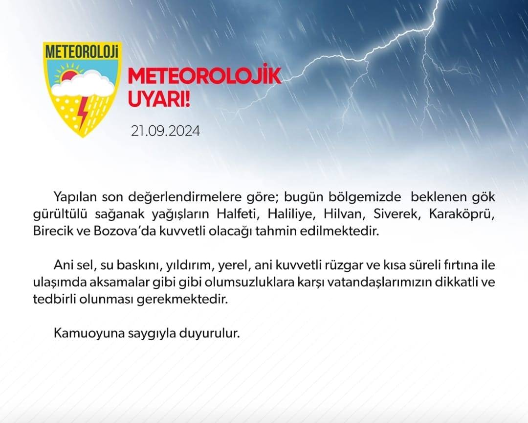 “ Yapılan son değerlendirmelere göre; bugün bölgemizde beklenen gök gürültülü sağanak yağışların Halfeti, Haliliye, Hilvan, Siverek, Karaköprü, Birecik ve Bozova'da kuvvetli olacağı tahmin edilmektedir.