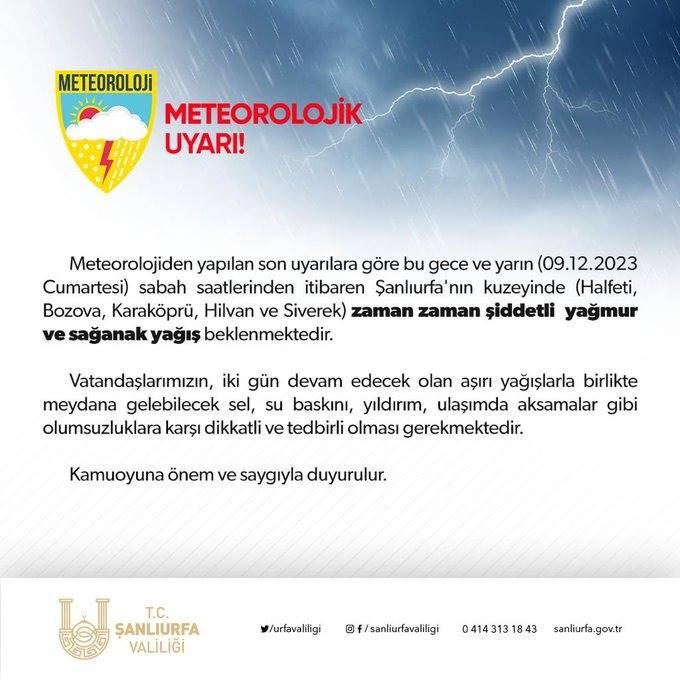 Şanlıurfa Valiliği’de yapılan açıklamaya göre, Vatandaşları, iki gün devam edecek olan aşırı yağışlarla birlikte meydana gelebilecek sel, su baskını, yıldırım, ulaşımda aksamalar gibi olumsuzluklara karşı dikkatli ve tedbirli olması konusunda uyardı.